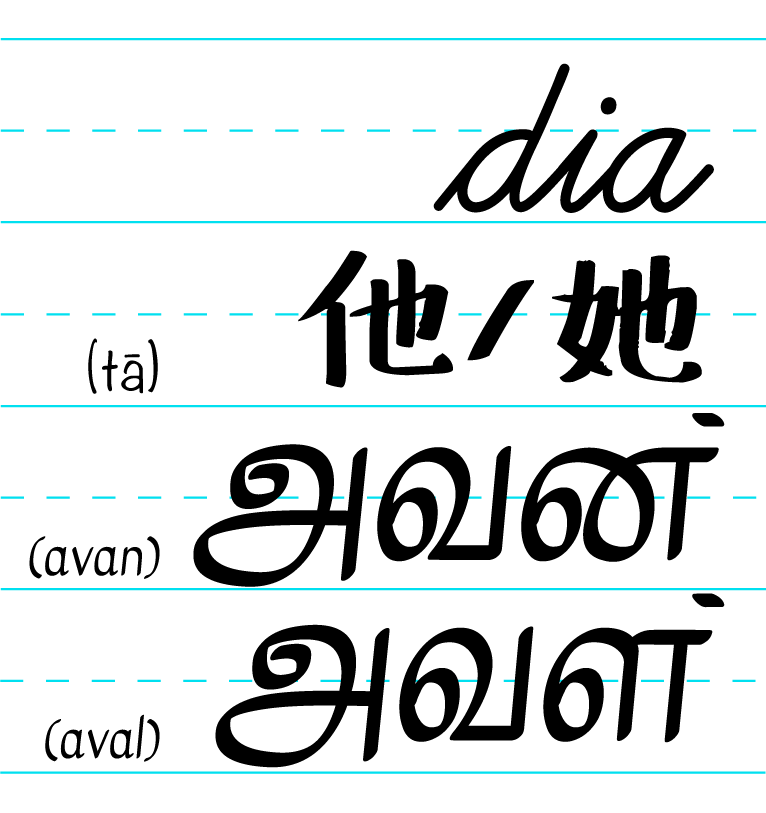 In Mandarin, 他 (he) and 她 (she) (both pronounced tā or ta1) are used; Malay uses the gender-neutral pronoun dia; while Tamil uses அவன் (he) or அவள் (she).